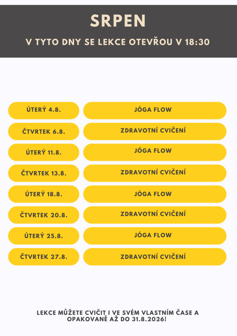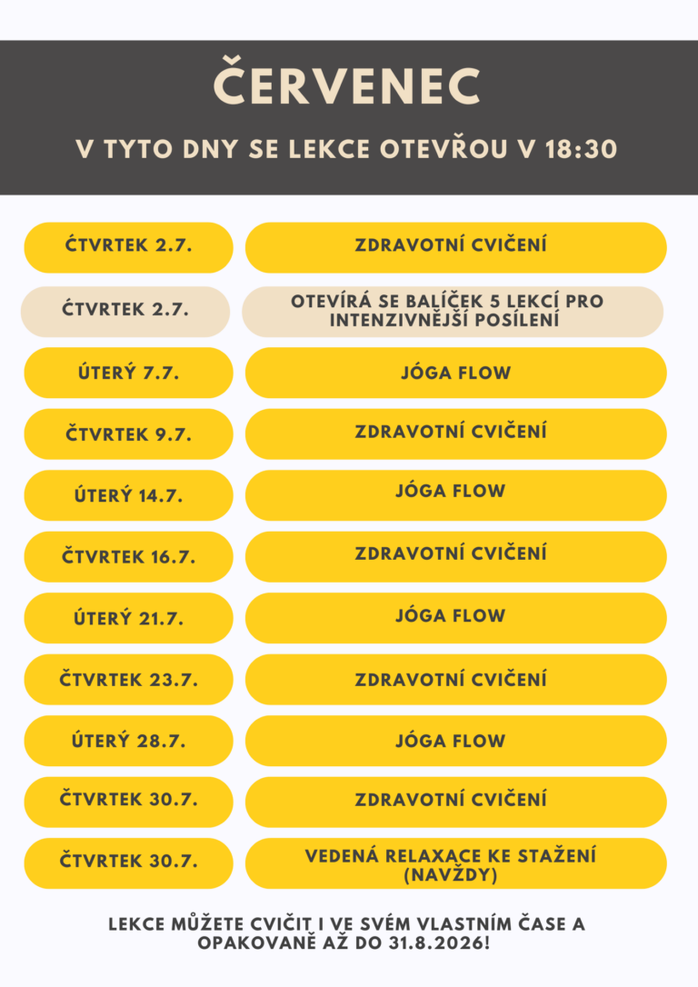 začínáme 2.7.2026 a lekce budou přibývat 2x týdně, a to každé úterý a čtvrtek. Zůstanou k dispozici až do 31.8.2026. Otevřou se vždy v 18:30, pokud chcete cvičit "živě" hned. Můžete ale cvičit i ve svém vlastním čase, a k lekcím se vracet i zpětně, kolikrát budete chtít.